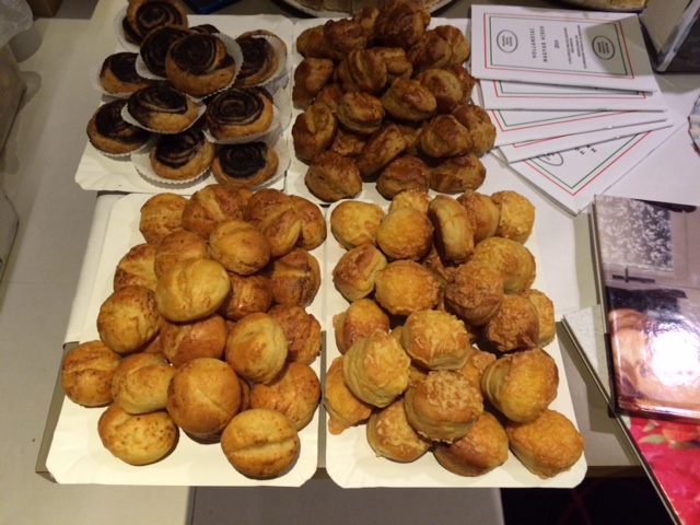 We gaan naar de bakkersproducten. Tamás haalt er een dik boek bij Culinaria, Hongaarse specialiteiten van uitgeverij Könemann. ‘Hier hebben we de Beigli, gerold gebak. De ene keer wordt het deeg gevuld met maanzaad, de andere keer met walnoten. Marianne – ook werkzaam in de winkel – gaat het binnenkort maken. Het is typisch iets voor de Kersttijd. Marianne maakt ook taarten en andere producten als spekbroodjes, tepertős pogácsa.
