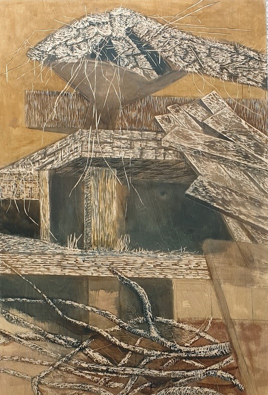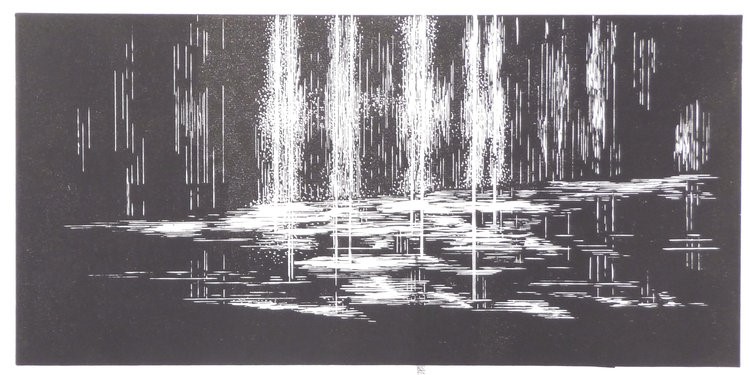 Een / twee dagen per week is ze actief met houtsneden en linosneden. Ze doet het ook af en toe tussendoor als een schilderij moet drogen. Ze drukt door middel van de etspers op papier en soms zelfs meteen op het hout. De onderwerpen zijn dezelfde als die op de schilderijen. Op enkele hout- en linosneden zijn vluchtelingen te zien, die zojuist een grote ramp hebben meegemaakt. Op dit moment is bij houtsneden water het onderwerp. “Water lijkt onschuldig, maar heeft een grote kracht. Het kan veel kwaad aanrichten voor de mens. Voor de natuur maakt ’t niet uit.” Ze drukt vaak af met behulp van een lepel. “Met een lepel kan ik bepalen hoe dicht ik druk. Ik sta af en toe op tafel om meer zwaartekracht te hebben. Met die lepel wordt alles een beetje luchtig, lichter. Maar rondom, aan de randen is het meestal pikzwart.”