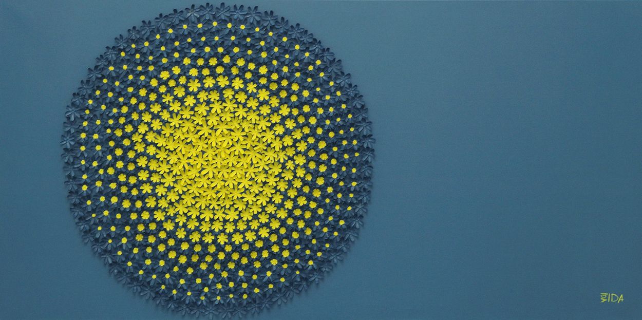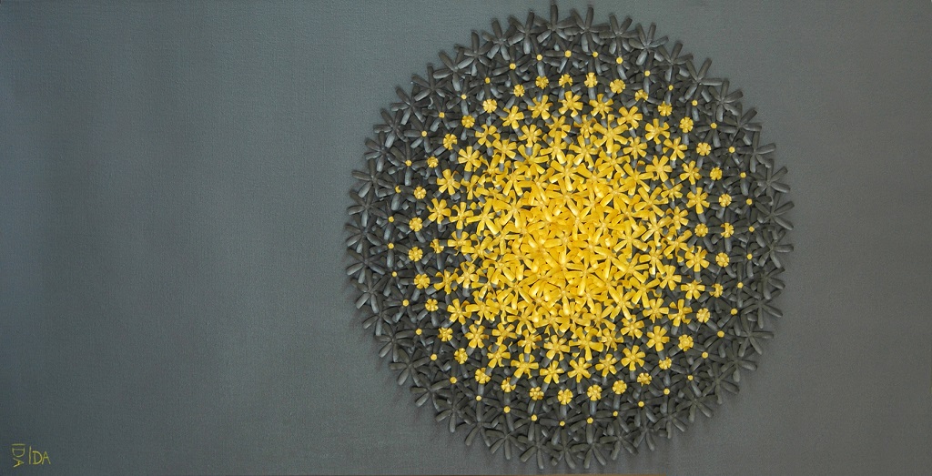 She has numbered the Birth of an Idea series with roman numerals. There are about seventy works and the series has not ended yet. Is there a key work to designate? That is the case. Ida Kubler: “I would say Birth of An Idea LXV. Birth of An Idea LXV (see image 4) is not only the largest piece in the series to date (100” x 50”), it was the first work to be commissioned by a charity. This charity is located in San Francisco, California; it transforms treatment areas in hospitals into havens of beauty and creativity. The artwork contains approximately 500 cocoons. Five hundred people were involved in the creation of this piece and in the financial support for the organization. Each cocoon has the name of the participant inscribed inside it. The colors are bright cadmium yellow in the middle to symbolize strength, and king’s blue in the background to symbolize communication.”