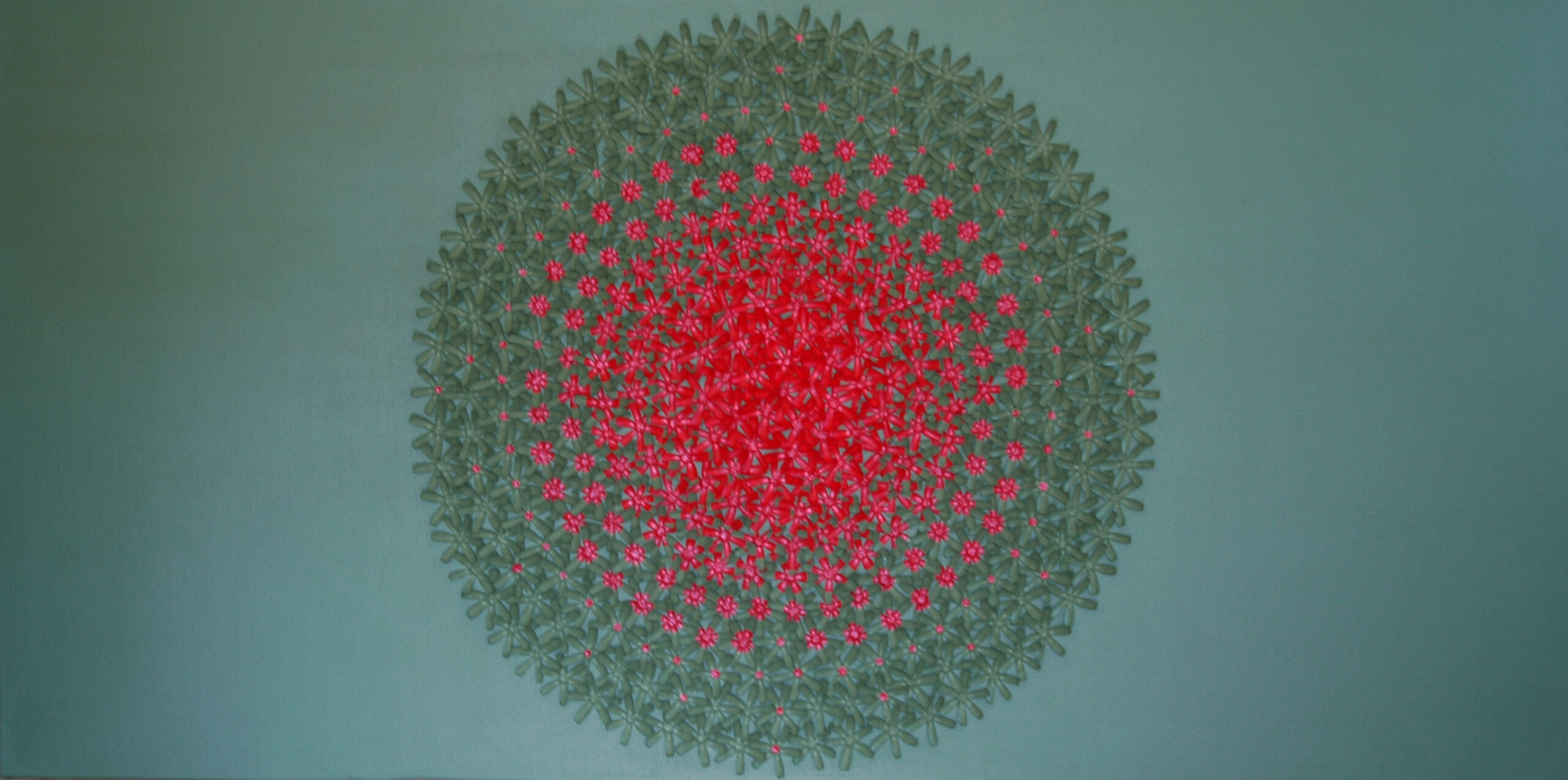 On Ida Ivanka Kubler’s canvases you see circle settings consisiting of an abundance of painted and sculptured silk cocoons. Kubler transforms cocoons left behind by the silk moth from their original identity into trancendent assemblages of colors.