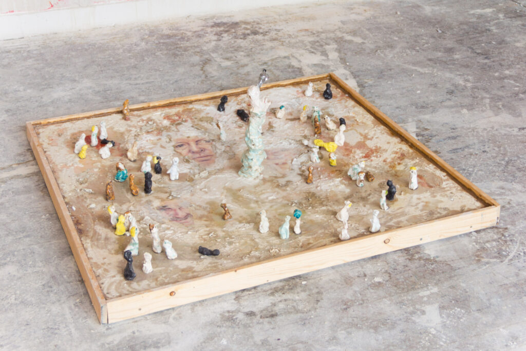 She has a preference for what she calls ‘odd humor’, black humor. She likes to play with clichés and she does that through layered work, in which she combines realistic images with plaster, photos, epoxy and strange characters. Often there is shown a grid. Why does she bring this element in?