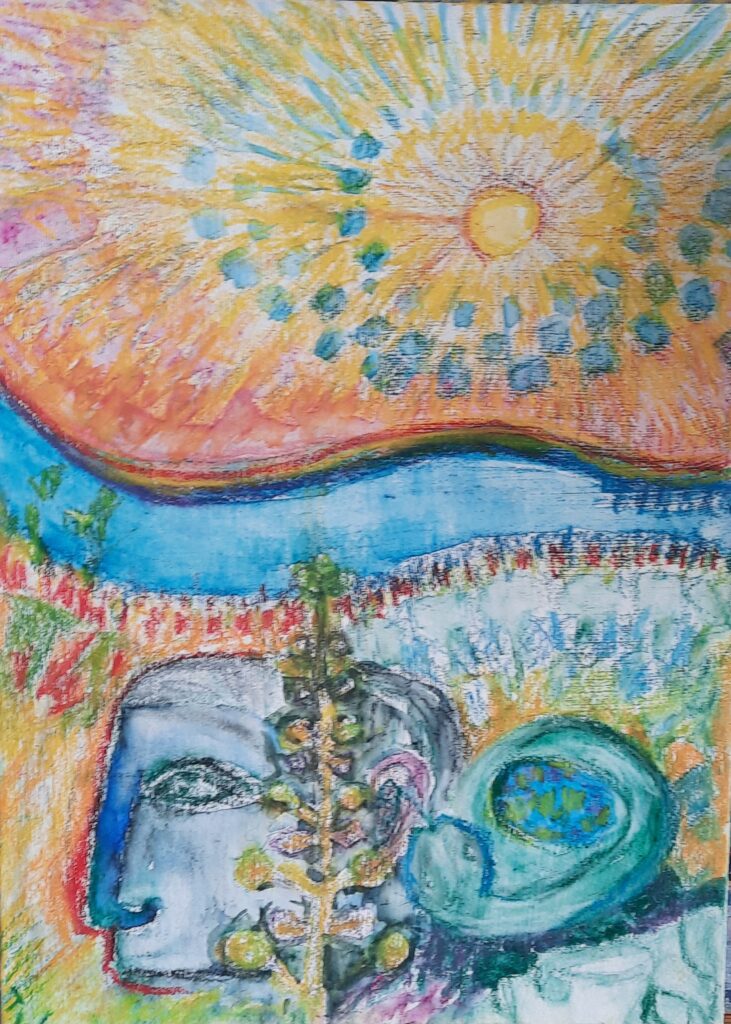 “Een wasco tekening, uit mijn hoofd gemaakt. Bij Marianne.”