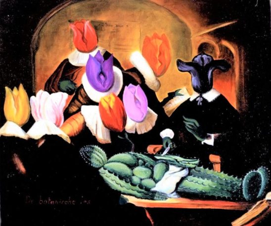 Een tweede sleutelwerk is ‘De Botanische Les’ uit 1991, geïnspireerd door ‘De Anatomische Les’ van Rembrandt. Tulpen buigen zich over een cactus om de ziekte op te sporen. “Een cultuur onderzoekt een andere cultuur. De onderzoekers moeten voorzichtig zijn want de cactus (dat ben ik) heeft stekels.”