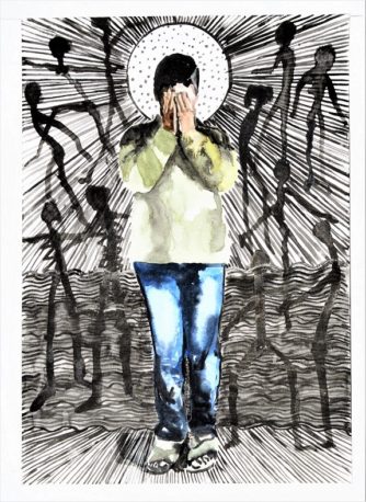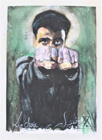Op dit moment woont hij langer in Nederland dan in Marokko. “Ik heb een brug geslagen. Ik heb veel dingen losgelaten om andere dingen toe te laten. Ik ervaar het als een verrijking van mijn leven.” Naast Maria en Jezus hangen er geaquarelleerde portretten van Marokkaanse jongens en een meisje. Ze maken onderdeel uit van een grote serie, vooral van jongens. “Ik wil ze een podium geven, hun verhaal vertellen. Hun problemen, dromen en hoop weergeven.” De jongens laten op een of ander manier, vaak met hun handen, zien dat ze ‘groot’ willen worden. Een maakt het V-teken. Het meisje maakt met haar telefoontje een selfie. “Zij wil contact leggen via sociale media. De jongens willen vooral aandacht.”