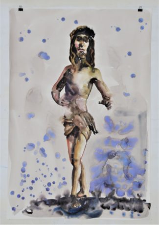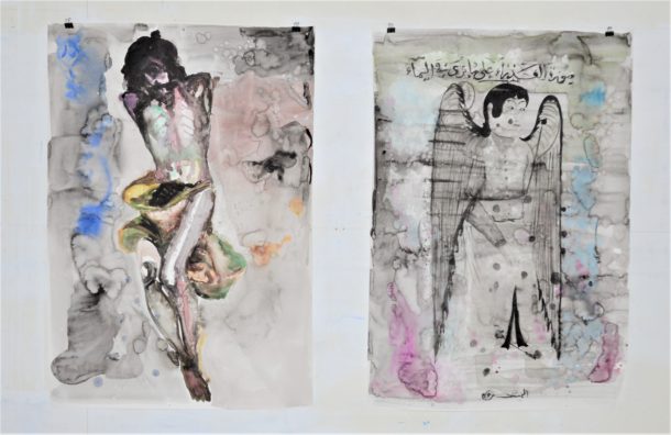 Aan twee aquarelwerken van flink formaat heeft hij deze ochtend nog geschilderd. Met de föhn zijn ze gedroogd, af en toe kijkt hij of er nog wat toegevoegd kan worden – weghalen is niet van toepassing. Rechts hangt een engel met een Arabische tekst erboven. Het blijkt Maria te zijn. Maria in de hemel. Nour-Eddine: “Gebaseerd op een Islamitische miniatuur van Maria. Maria figureert ook in Koran. Hetzelfde verhaal als in de Bijbel.” Links naast Maria zie ik Jezus in de kruisbeeldhouding. Jezus heeft geen armen. Zijn hoofd hangt naar beneden. Ter hoogte van zijn buik bevindt zich een soort buidel. Het lijkt wel op de buidel van een kangeroe. Nour-Eddine: “Misschien komt er iets uit de buidel.”