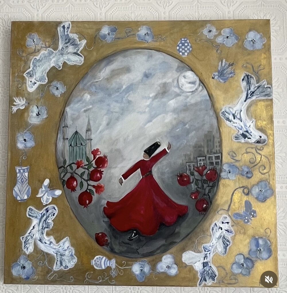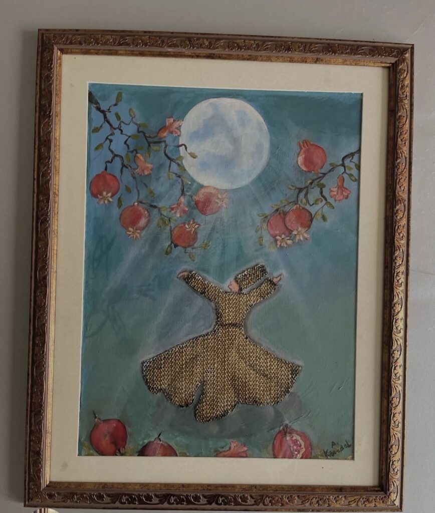 When I visit Aygul Kosedal, I have a beautiful view of the canalized Schinkel River. A beautiful gray cat looks at me. Above the gray sofa hangs a painting of a whirling dervish. The dance, often associated with the Mevlevi order of the poet Rumi, is a form of religious meditation to connect with the divine.