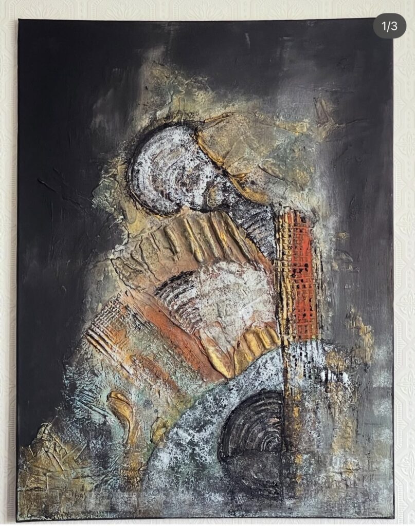 She creates both abstract and figurative work. Before me hangs a painting of a bride with a dress with a long train in the green heart of the Netherlands. In the background are windmills. In her hand, she holds a bouquet of red flowers. She points out that the wedding dress is made of fabric. She lets me feel it. It is indeed a puffed wedding dress, probably made with starch.