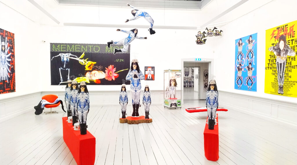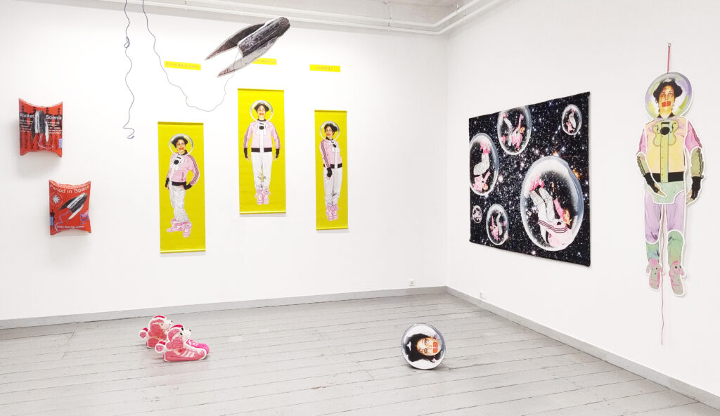 Aan de rechterkant Period in Space met tampons en Make up. Willen vrouwen wel make up in space? Te zien zijn vrouwen in roze met een gitaar op hun shirt en met rode make-up over hun mond. “Ik heb geen make up nodig in de ruimte, dat lijkt mij totaal overbodig. Ik heb niks met roze, maar voor deze installatie omarm ik het .