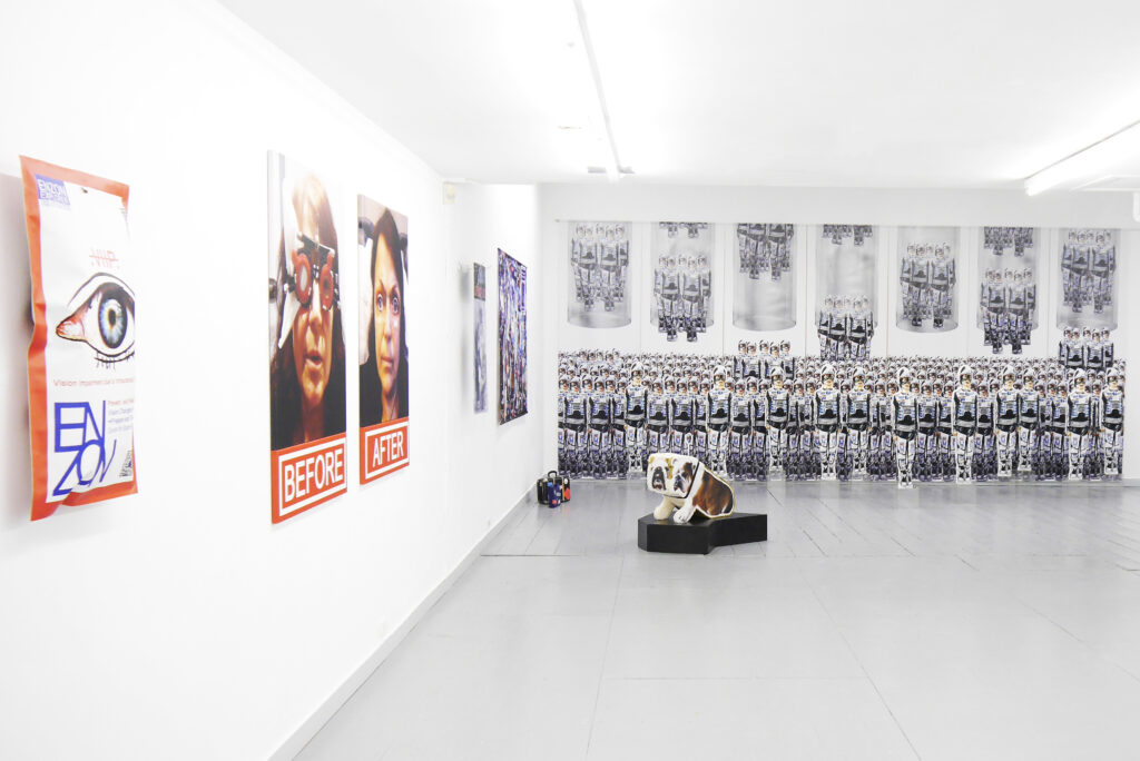 Ik kijk terug en zie de achterkanten van de verschillende figuren, weer heel anders dan de voorkant. Aan de linkermuur gaat het over Enzon Care en zelfs de moeder van Evelien is te zien met oogvormen van de opticien. Ze test een medicijn tegen oogboldruk zwelling die je krijgt als je de ruimte in gaat. “Moeder leeft niet meer, maar ze leeft wel voort in een kunstwerk, net als de Space Dog.”