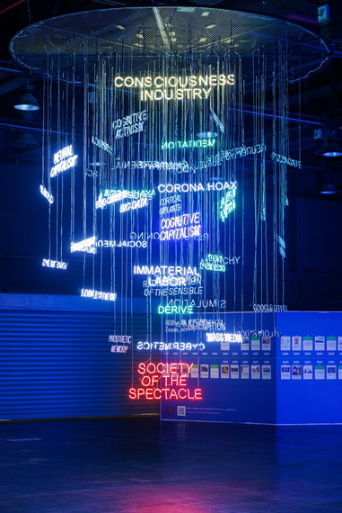 Het eerste deel, Cognitive Capitalism, duidt op het door computers aangedreven hyperkapitalisme waarin wij mensen niet enkel producent en consument zijn, maar ook grondstof. Onze data worden vermalen tot bouwstenen voor algoritmes die steeds zelfstandiger opereren. De volgende stap is dat ons brein wordt geprogrammeerd door de technologieën die we zelf hebben ontworpen. De hangende neonsculptuur van kunstenaar en neurowetenschapper Warren Neidich maakt ons bewust van deze technologische onderdompeling die we zelf bijna niet meer zien omdat we er al zo diep in zitten.