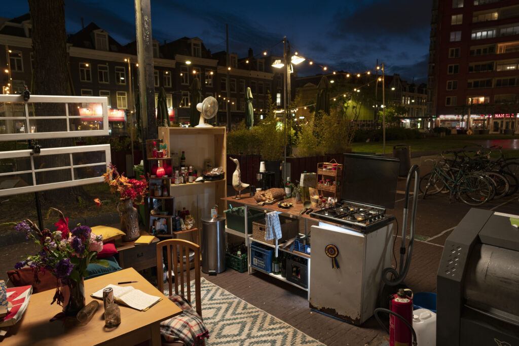 “Ik zag een constante stroom van spullen, waaronder veel meubilair. Dat kon ik zonder veel moeite omtoveren in een huiselijke scene door ze bijvoorbeeld te plaatsen op een vloerkleed, bedacht ik. Een lampje erbij dat ook licht kon geven.” Hij moest een limiet vinden, hij kwam uit een aantal spullen op een avond in een wijk. Het werd zijn muze. In 2019 maakte hij een eerste serie van vijf beelden in vijf stadswijken, het eerste beeld was in de Indische buurt.