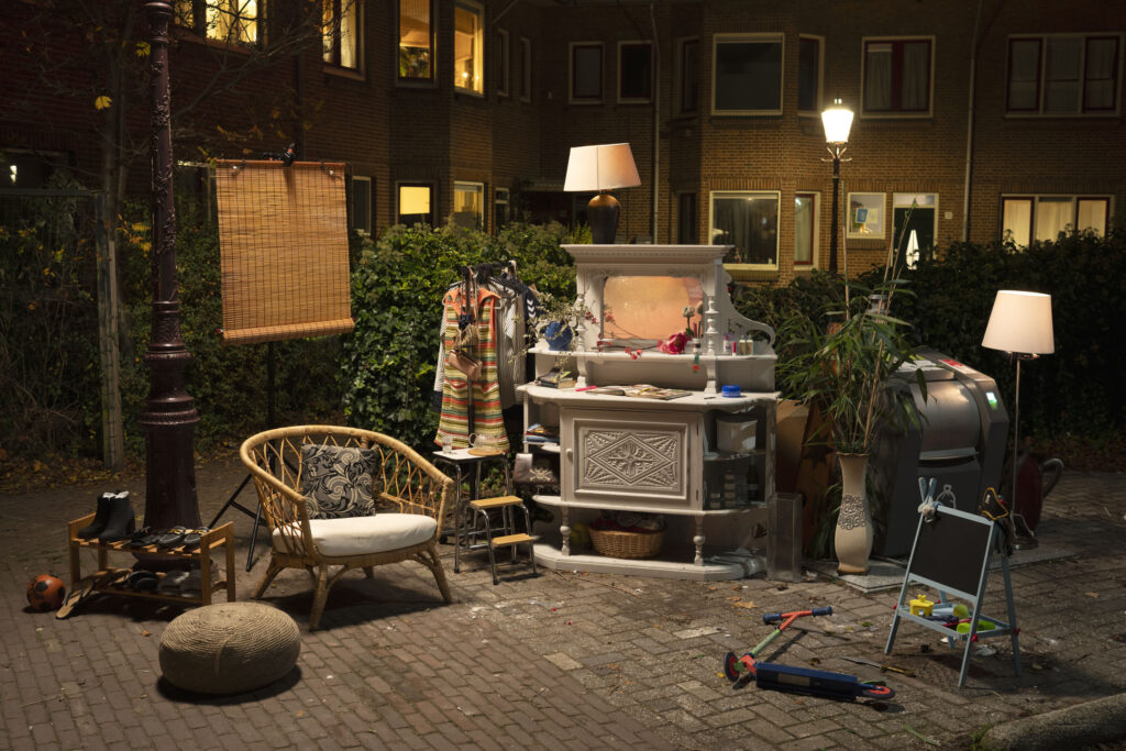 Op een grofvuil dag ging hij aan de slag. Met een busje ging hij met iemand uit de wijk rondrijden in een bepaalde buurt. “Je ziet ook andere busjes op zoek naar spullen, sommigen op zoek naar staal, anderen naar elektronica.” Hij sjouwde de spullen bij elkaar en maakte vervolgens een mooie combinatie van de spullen. “Ik lichtte het volledig uit, ook naar de omgeving. In de lampen zit flitsertje en dat zorgde dat het tot leven komt. Het voelde alsof het nèt verlaten was. Nederlands gezellig. Elke foto is een enkele opname, ik combineer twee technieken om het eindresultaat te behalen, flitslicht voor de voorgrond en een lange sluitertijd voor het doorlichten van de achtergrond.”