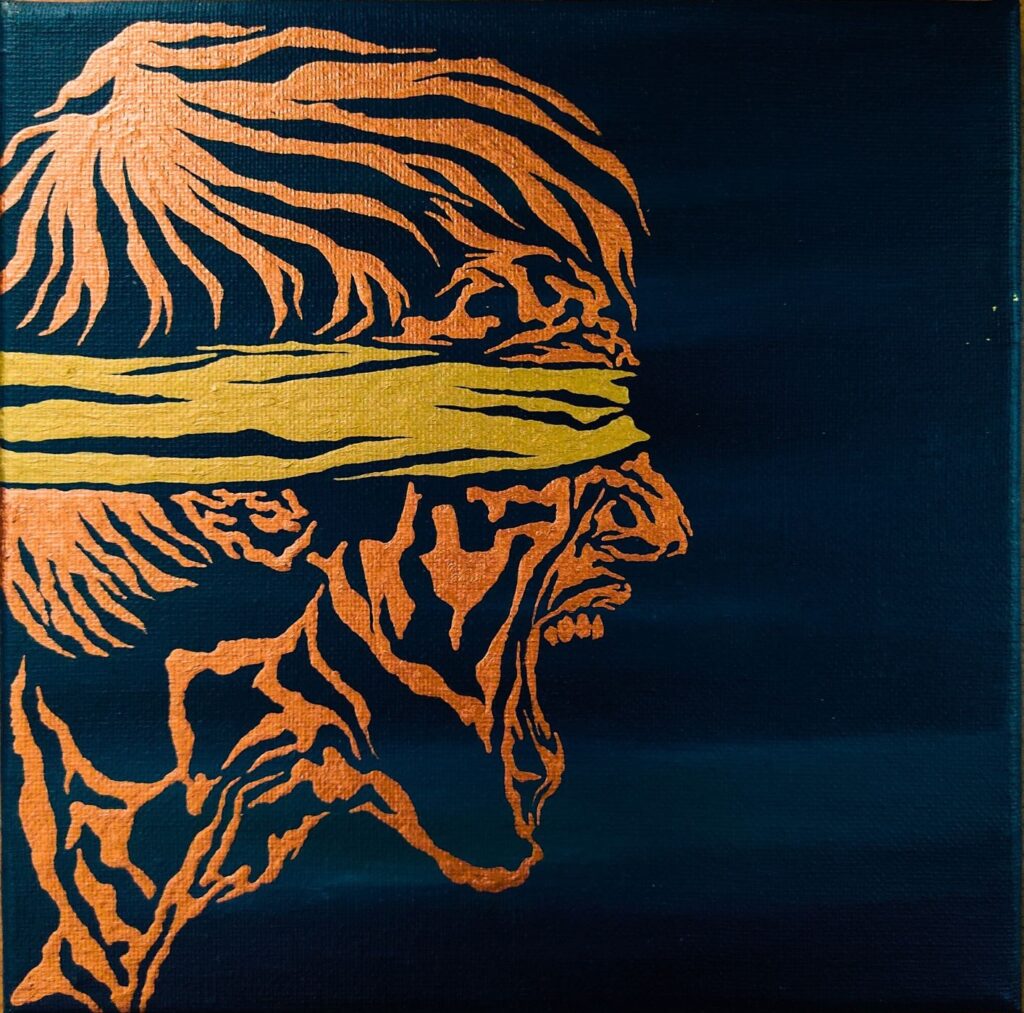 Ik draai me om om een aantal van zijn schilderijen van dichterbij te bekijken. In een van zijn werken zien we de gezichten van twee figuren met verband om; de ene heeft een blinddoek, de andere een doek over zijn mond. “Ik probeer de twee mensen met elkaar te laten praten. Het heet ‘De Blinde en de Stomme’. Persoon 1 ziet niets, schreeuwt en gilt; persoon 2 ziet alles, maar wil niet praten.
