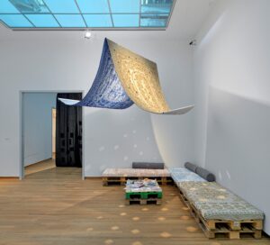 In het Pop-up museum stap je in een betoverende wereld van geborduurde doeken en zachte kussens. Neem plaats op een sofa onder de installatie Night Holes (2024). De doeken houden alles wat boos en eng is buiten, maar laten dromen en hoop door. De film die gedraaid wordt sluit daarbij aan.The Sea is a Stereo: Paris without a Sea (2007-2008) gaat over een groep mannen die in Beiroet woont. Ondanks constante dreiging van geweld en oorlog houden ze vast aan hun gewoontes en vertoeven ze elke dag aan zee. Dit is zowel een manier om te overleven als een daad van verzet. Door Al Solhs interviewwijze voegt ze op geheel eigen manier humor toe.